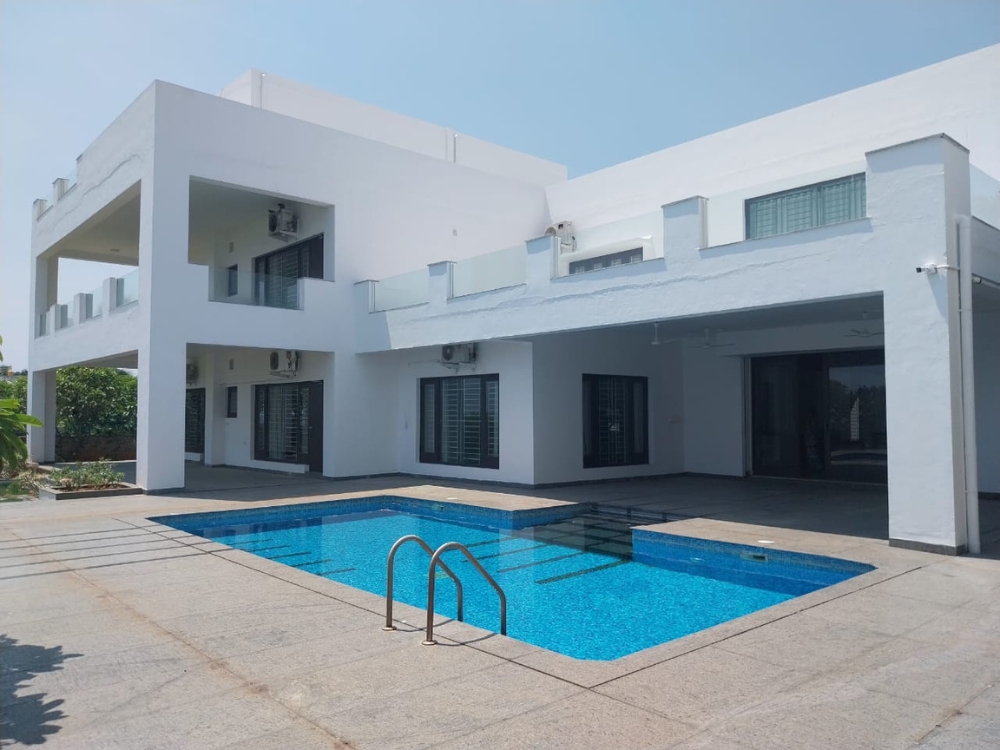 Sprawling fully furnished 7 BHK home with 12,000 Sq.Ft. built-up area on 10 grounds. Comes with 7 bathrooms, ample car parking, power backup, staff quarters, swimming pool, clubhouse, and garden. West-facing and approx. 10 years old — a rare luxury retreat.