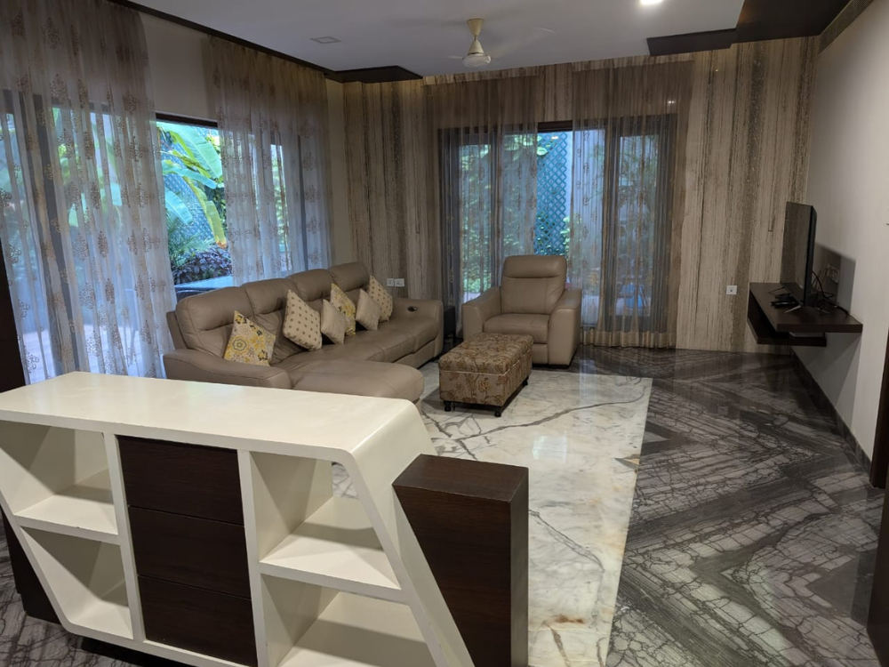 Spacious 4 BHK fully furnished independent house with 7,000 Sq.Ft. built-up area on 3 grounds in Chennai. Features 4 bathrooms, AC, modular kitchen, power backup, 2 car parks, swimming pool, and garden. South facing, 8 years old—ideal for luxurious family living with modern comforts.